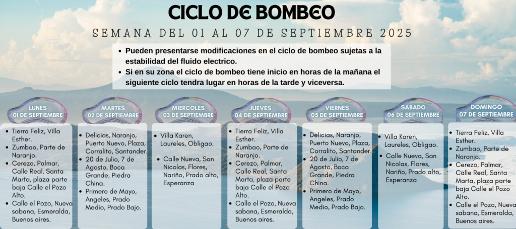 Compartimos con toda la comunidad el nuevo cronograma del ciclo de bombeo de agua, vigente para la semana del lunes 1 al domingo 7 de septiembre. Le invitamos a consultar el día que corresponde a su sector y tener presentes las indicaciones del servicio.