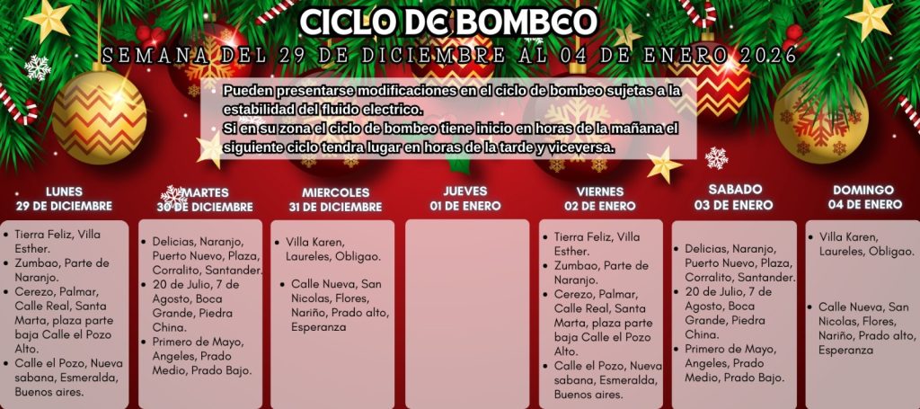 - Miércoles 31 de diciembre y Domingo 04 de enero: Villa Karen, Laureles, Obligao, Calle Nueva, San Nicolas, Flores, Nariño, Prado alto y Esperanza.